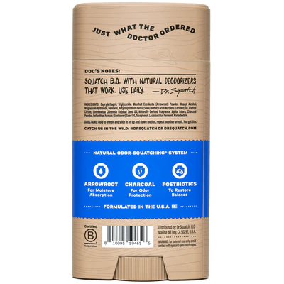 The Squatch difference. We craft natural, high-performance personal care products in manly scents with only the finest ingredients Mother Nature has to offer. Squatch B.O. with natural deodorizers that work! Use daily. Aluminum Free